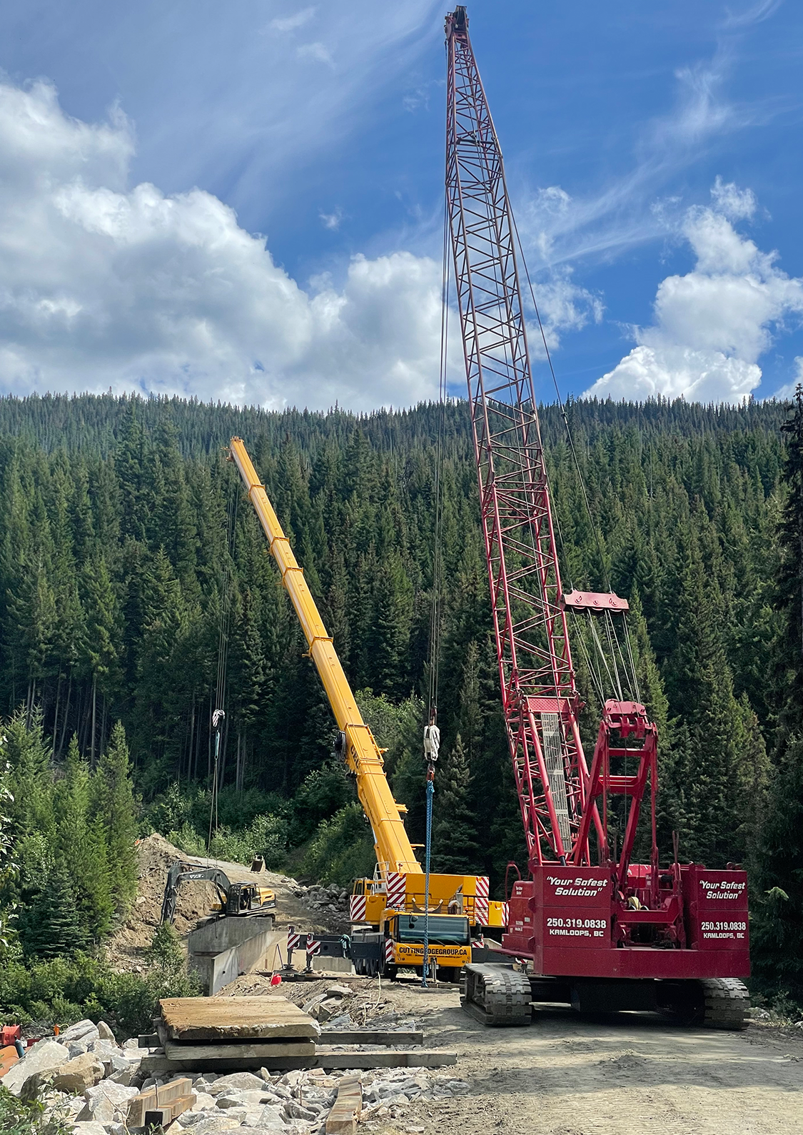 At site K1697 10km Lodestone Bridge, the existing 9m steel girder and timber deck structure was deactivated and removed, with the steel girders salvaged for the Ministry of Forests. CEC then installed a new 12m precast slab girder bridge, supported by pipe columns and precast spread footings. Due to environmental sensitivities at the site, the project included instream works such as channel improvements and the addition of rip rap to protect against erosion and maintain ecological integrity.