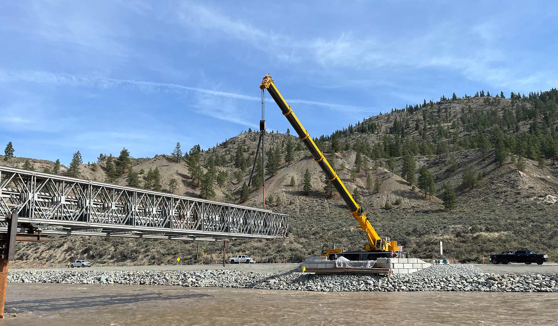 Description: CEC carried out the bridge construction for the Shackan Bridge. The scope involved supplying and installing 30-meter-deep foundations with 24-inch diameter piles, utilizing both drop hammer and diesel hammer techniques for efficient installation. CEC also fabricated and installed steel pile caps to complete the substructure. As part of the project, the team modified one existing concrete abutment and formed and poured two new concrete, cast-in-place, abutments. The project concluded with the assembly and installation of a 55-meter Acrow bridge using engineered launch system with crane support for launch and tandem placement. This project was completed in a semi-secluded location without cell service, demonstrating CEC’s ability to deliver complex infrastructure solutions in remote environments.